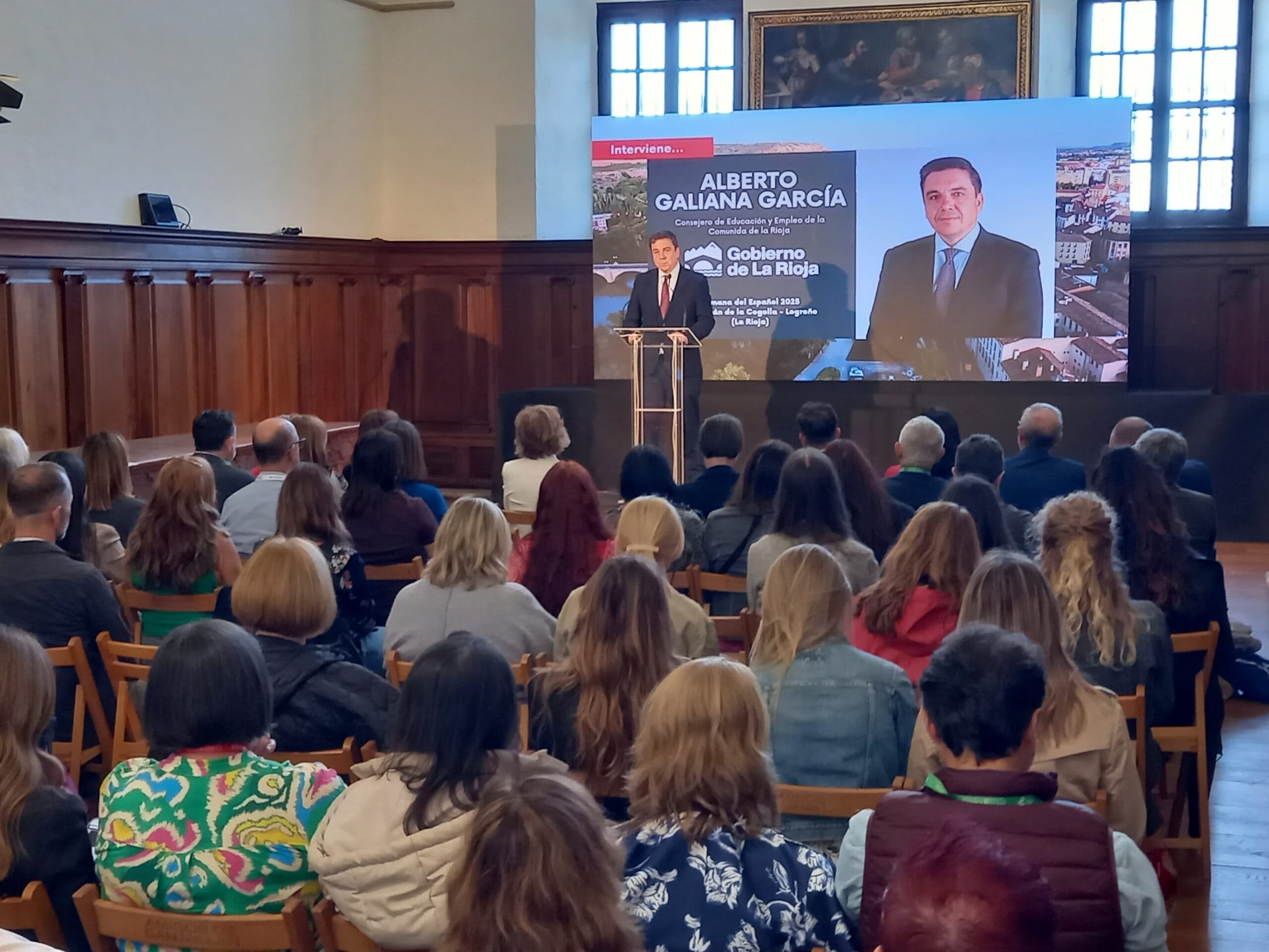 El consejero de Educación y Empleo, Alberto Galiana, acompañado de la coordinadora general de la Fundación San Millán de la Cogolla, Almudena Martínez, y la vicepresidenta de la Federación de Escuelas de Español como Lengua Extranjera (FEDELE), Begoña Llovet, ha inaugurado hoy, día 1 de octubre, en el Monasterio de Yuso (San Millán de la Cogolla), la IV Semana del Español, un encuentro que congrega a 240 participantes nacionales e internacionales con el objetivo de potenciar la calidad de la enseñanza del español y poner en valor el turismo idiomático.