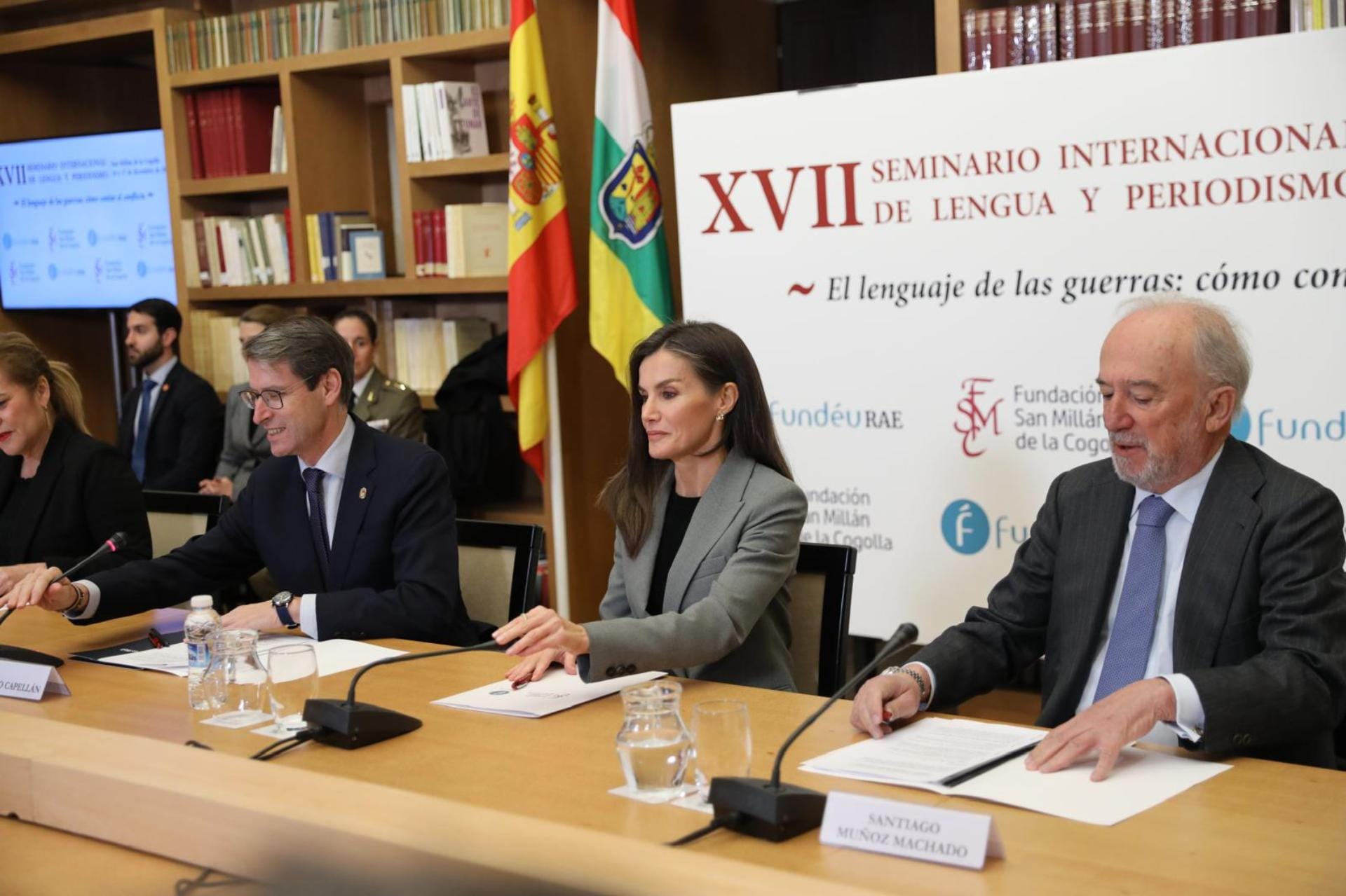 S. M. la Reina doña Letizia presidió este martes la clausura de la XVII edición del Seminario Internacional de Lengua y Periodismo, organizado por la FundéuRAE y la Fundación San Millán de la Cogolla, y titulado en esta ocasión El lenguaje de las guerras: cómo contar el conflicto. Las palabras de bienvenida de la sesión corrieron a cargo de Gonzalo Capellán, presidente de La Rioja y de la Fundación San Millán de la Cogolla, y la sesión de cierre estuvo dirigida por Santiago Muñoz Machado, presidente de la FundéuRAE y director de la RAE. La clausura contó, además, con la presencia del secretario de Estado de Comunicación, Abelardo de la Rosa; del consejero de Cultura, Turismo, Deporte y Juventud de La Rioja y vicepresidente de la Fundación San Millán de la Cogolla, José Luis Pérez Pastor; del presidente de la Agencia EFE y vicepresidente de la FundéuRAE, Miguel Ángel Oliver, y de varios miembros del patronato de la FundéuRAE: las académicas de la RAE Carme Riera —vicedirectora de la institución—y Soledad Puértolas, y el periodista Álex Grijelmo.